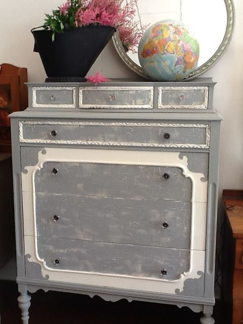 Tall dresser from the 1930’s.Excellent craftsmenship and design. Measures 47″ tall x38″ wide x14″ deep. I did this piece in a Paris Grey w/old white and added a crackle finish… Offered at @325.
